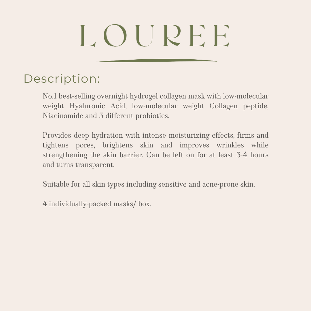 No.1 best-selling overnight hydrogel collagen mask with low-molecular weight Hyaluronic Acid, low-molecular weight Collagen peptide, Niacinamide and 3 different probiotics.