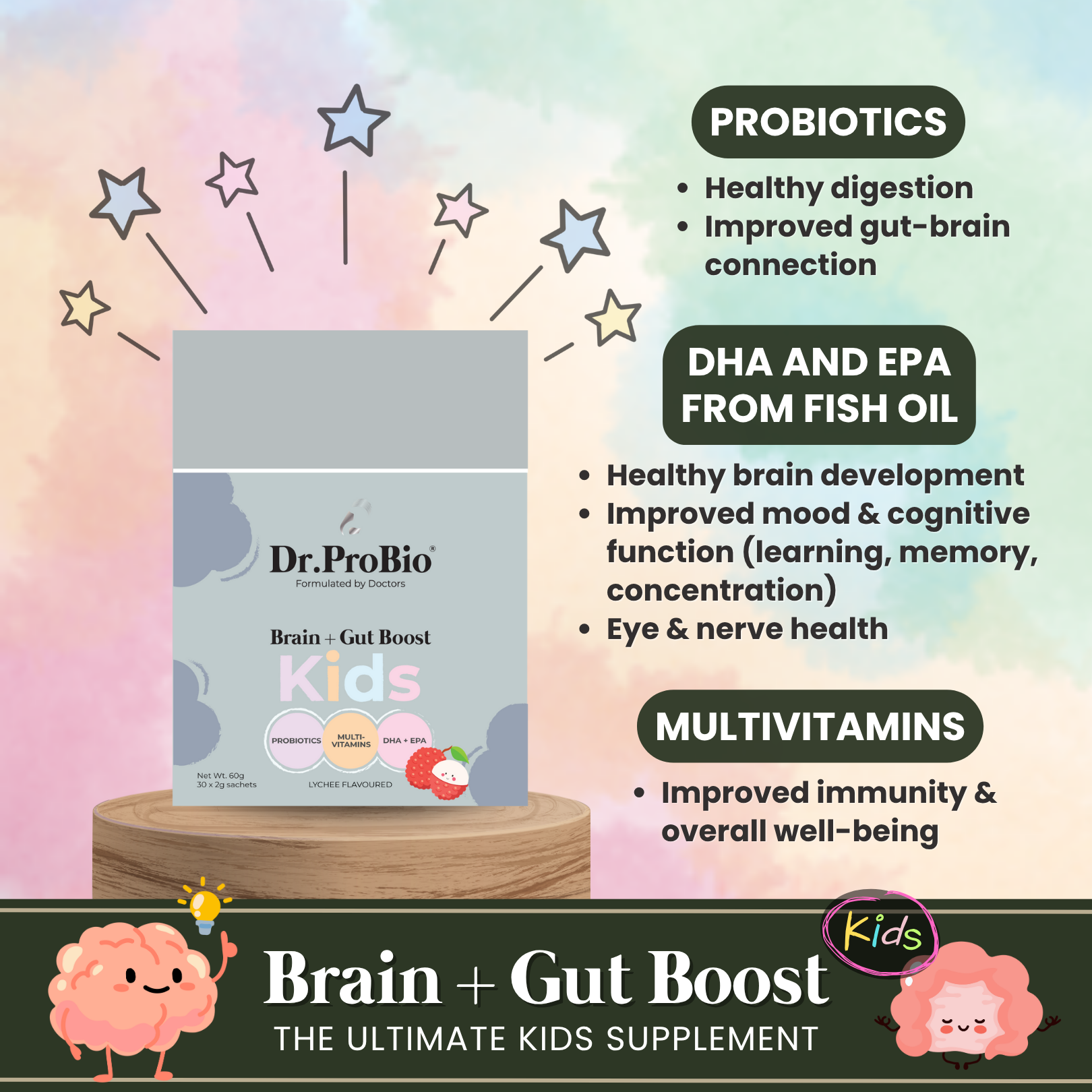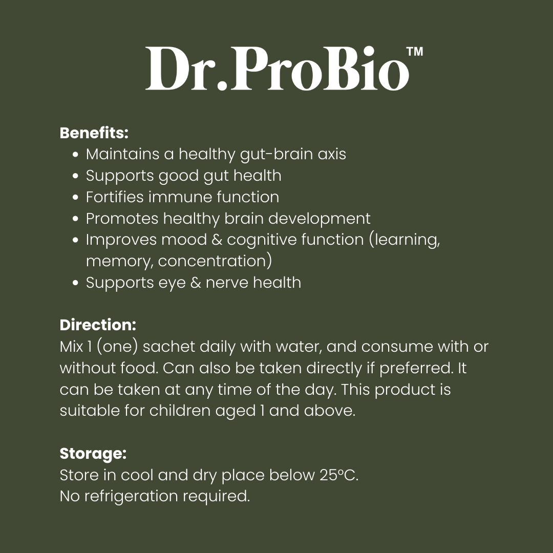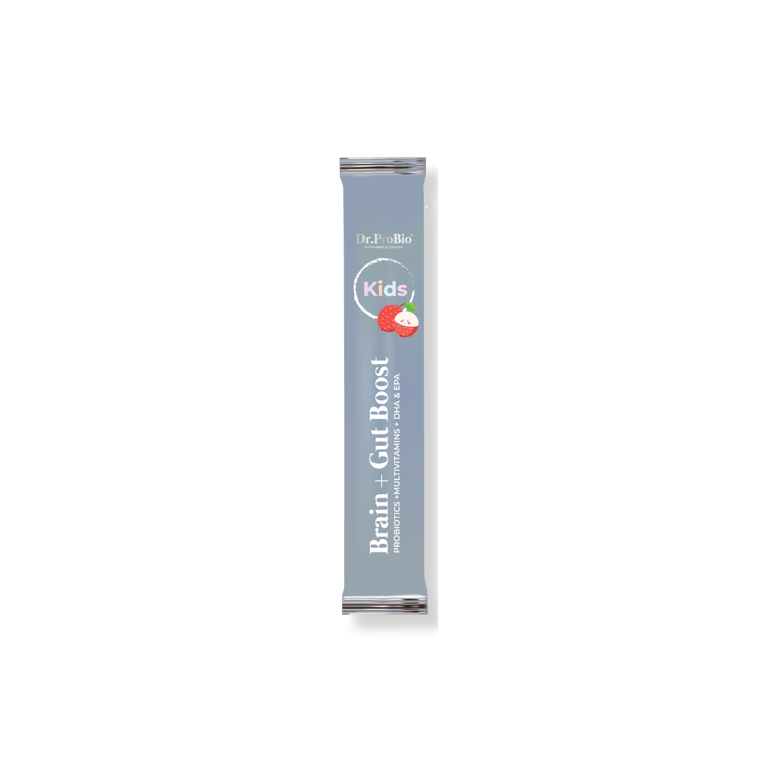 The ultimate 3-in 1 kids supplement containing probiotics + multivitamins + DHA and EPA from fish oil, Dr.ProBio's Brain + Gut Boost supports gut health, brain health and immunity in children.