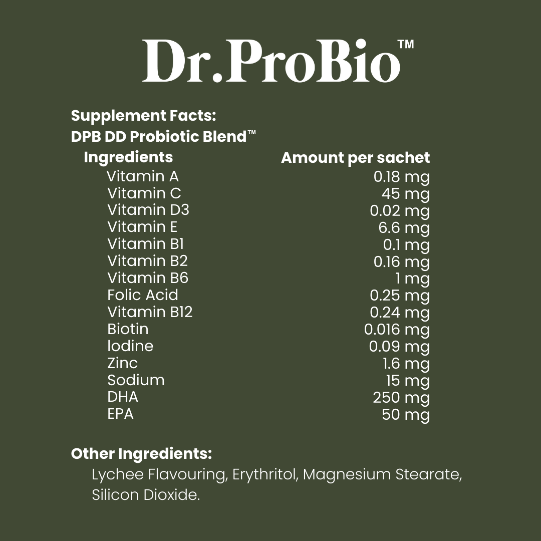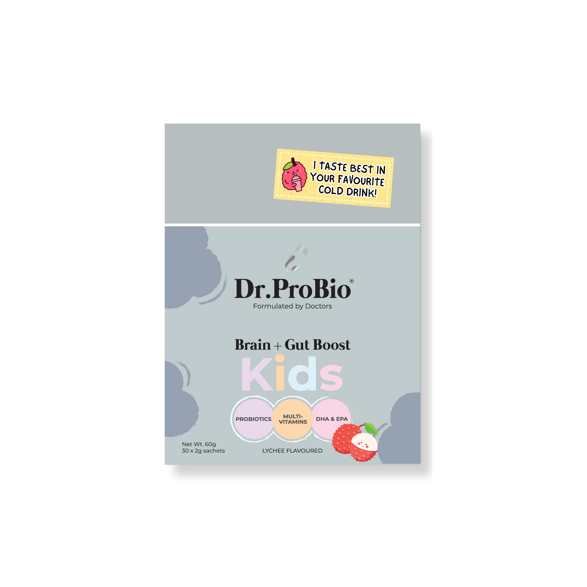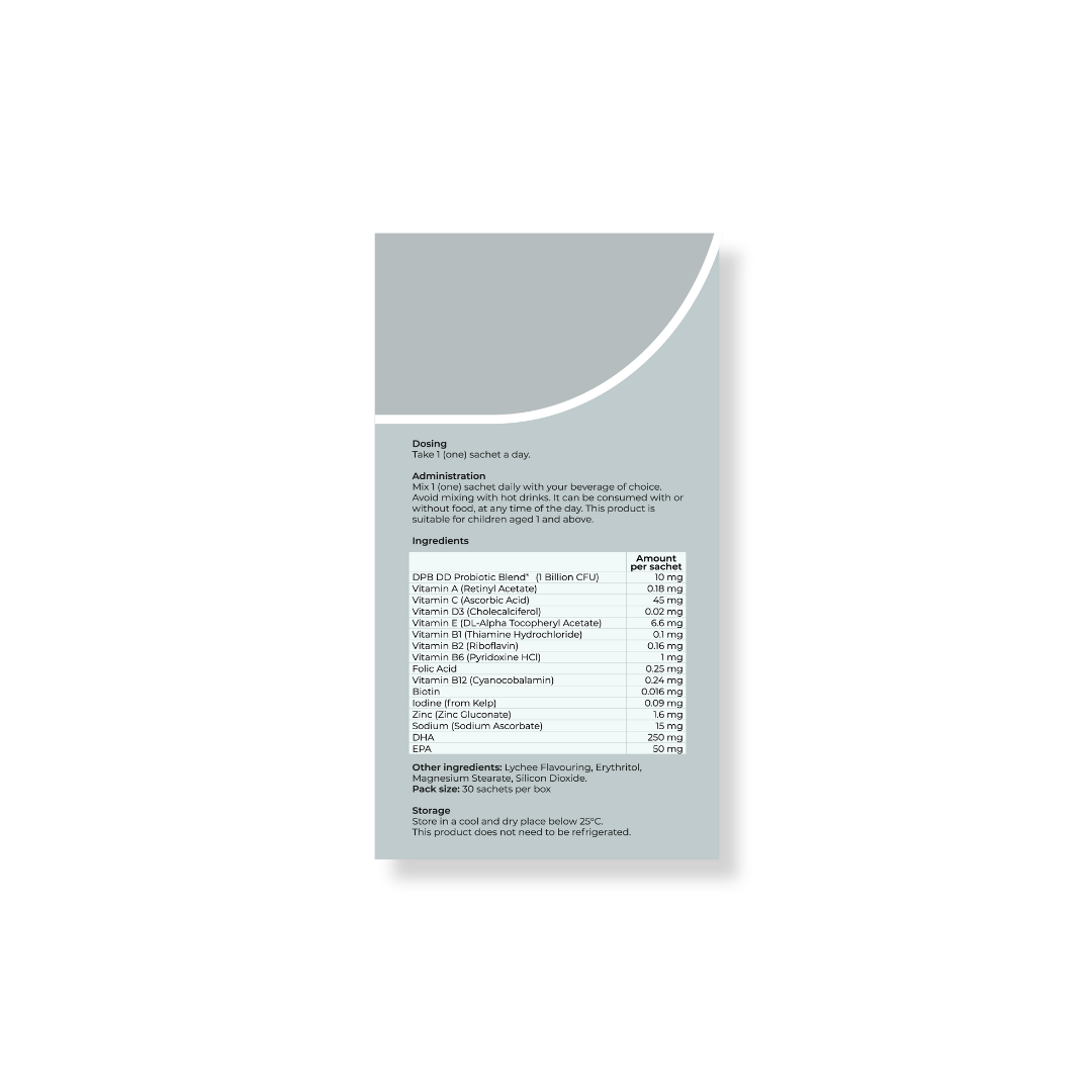 The ultimate 3-in 1 kids supplement containing probiotics + multivitamins + DHA and EPA from fish oil, Dr.ProBio's Brain + Gut Boost supports gut health, brain health and immunity in children.