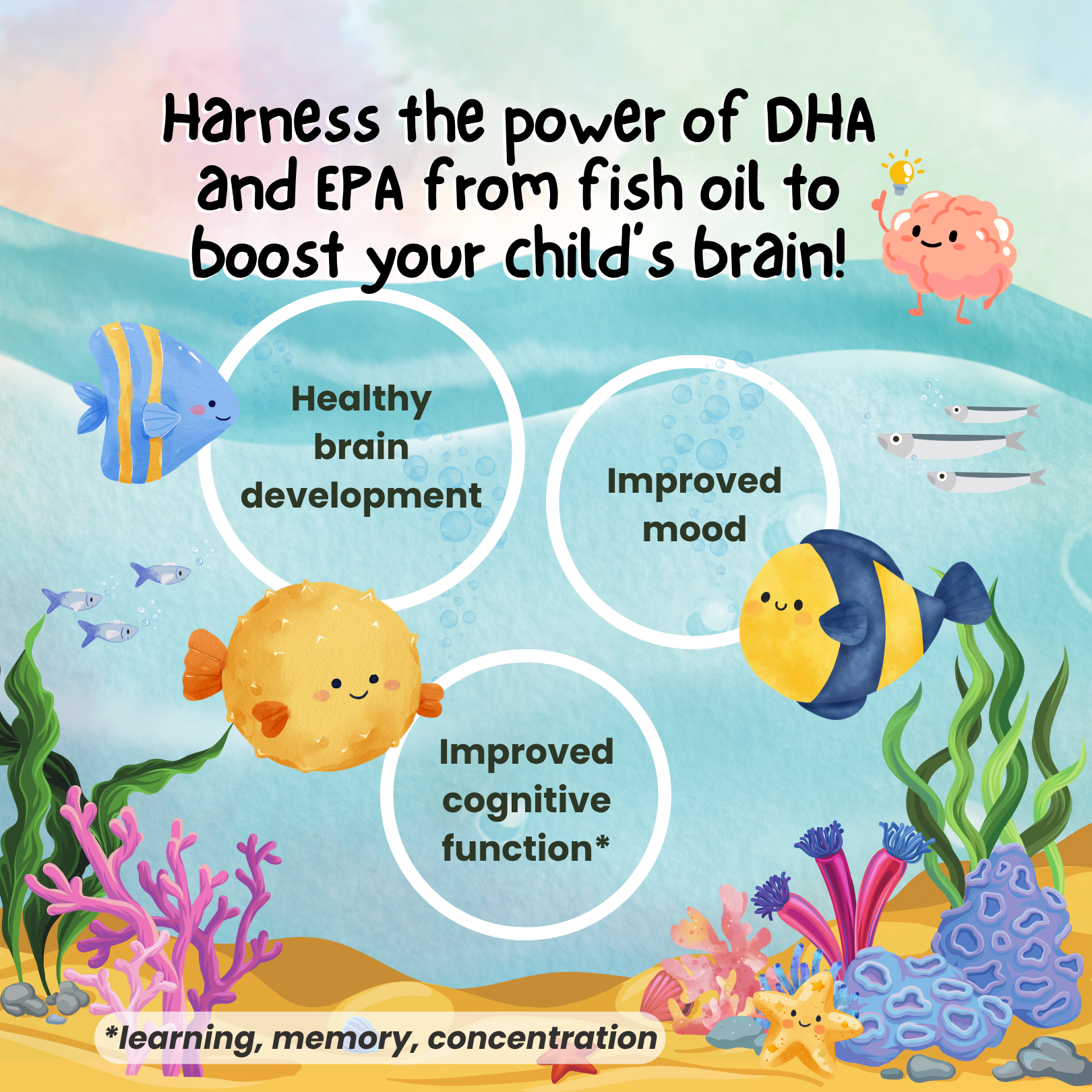 - Supports healthy brain development, cognition and mood