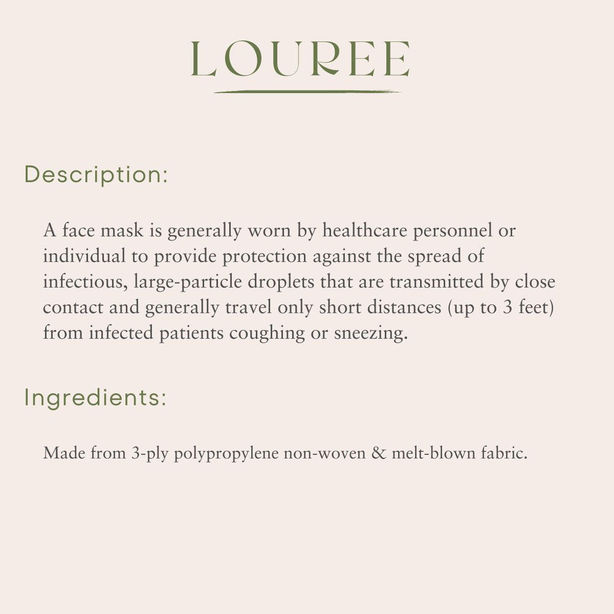 A face mask is generally worn by healthcare personnel or individual to provide protection against the spread of infectious, large particle droplets that are transmitted by close contact and generally travel only short distances (up to 3 feet) from infected patients who are coughing or sneezing.